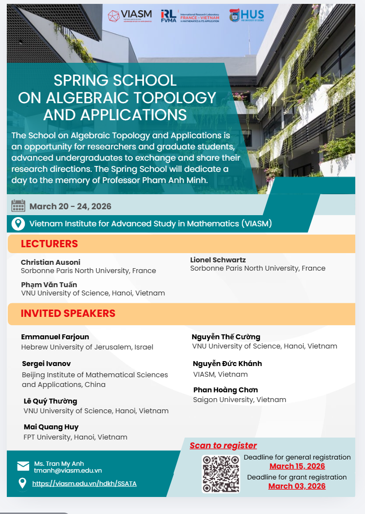 The School on Algebraic Topology and Applications is an opportunity for researchers and graduate students, advanced undergraduates to exchange and share their research directions. The Spring School will dedicate a day to the memory of Professor Pham Anh Minh.