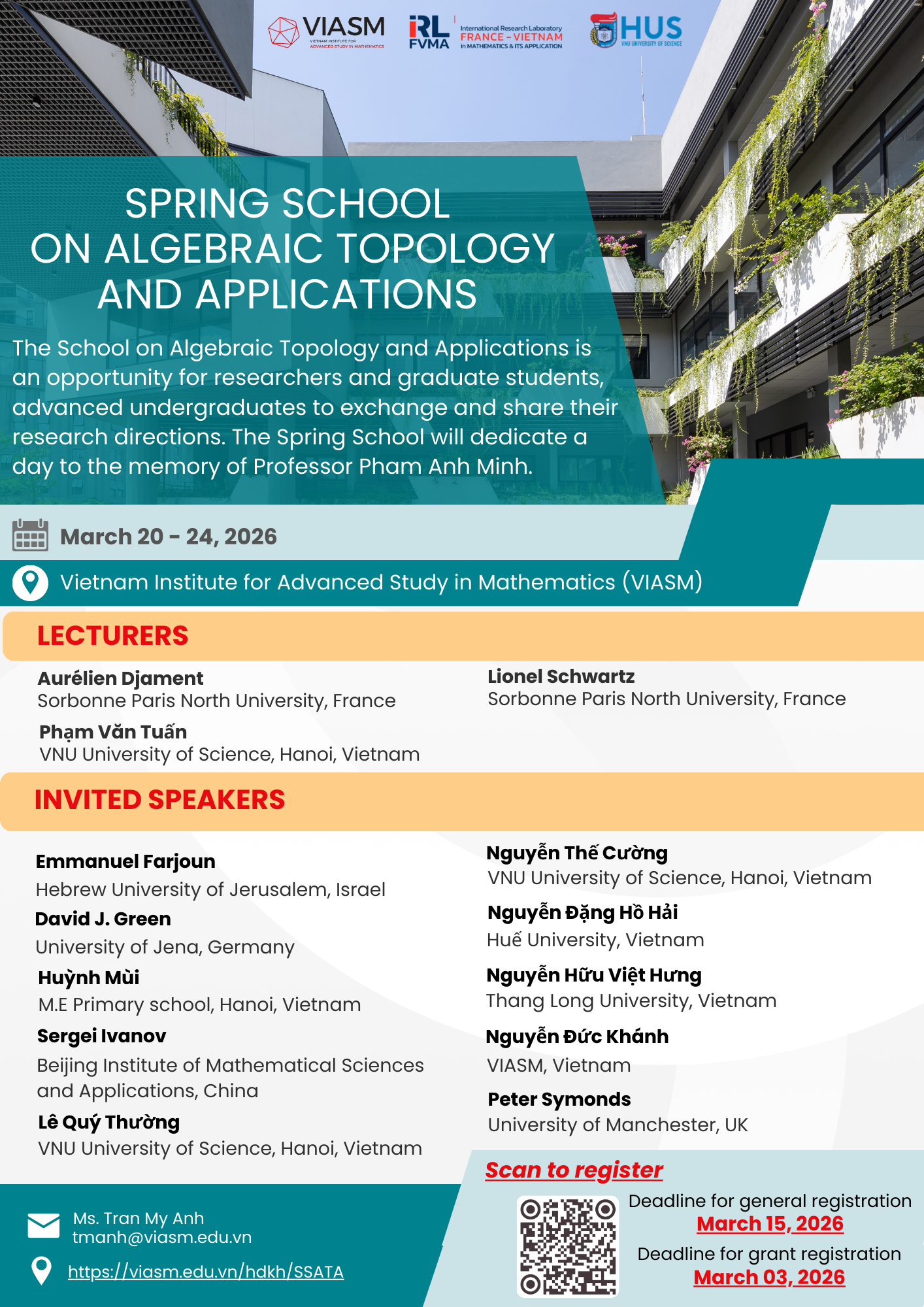The School on Algebraic Topology and Applications is an opportunity for researchers and graduate students, advanced undergraduates to exchange and share their research directions. The Spring School will dedicate a day to the memory of Professor Pham Anh Minh.