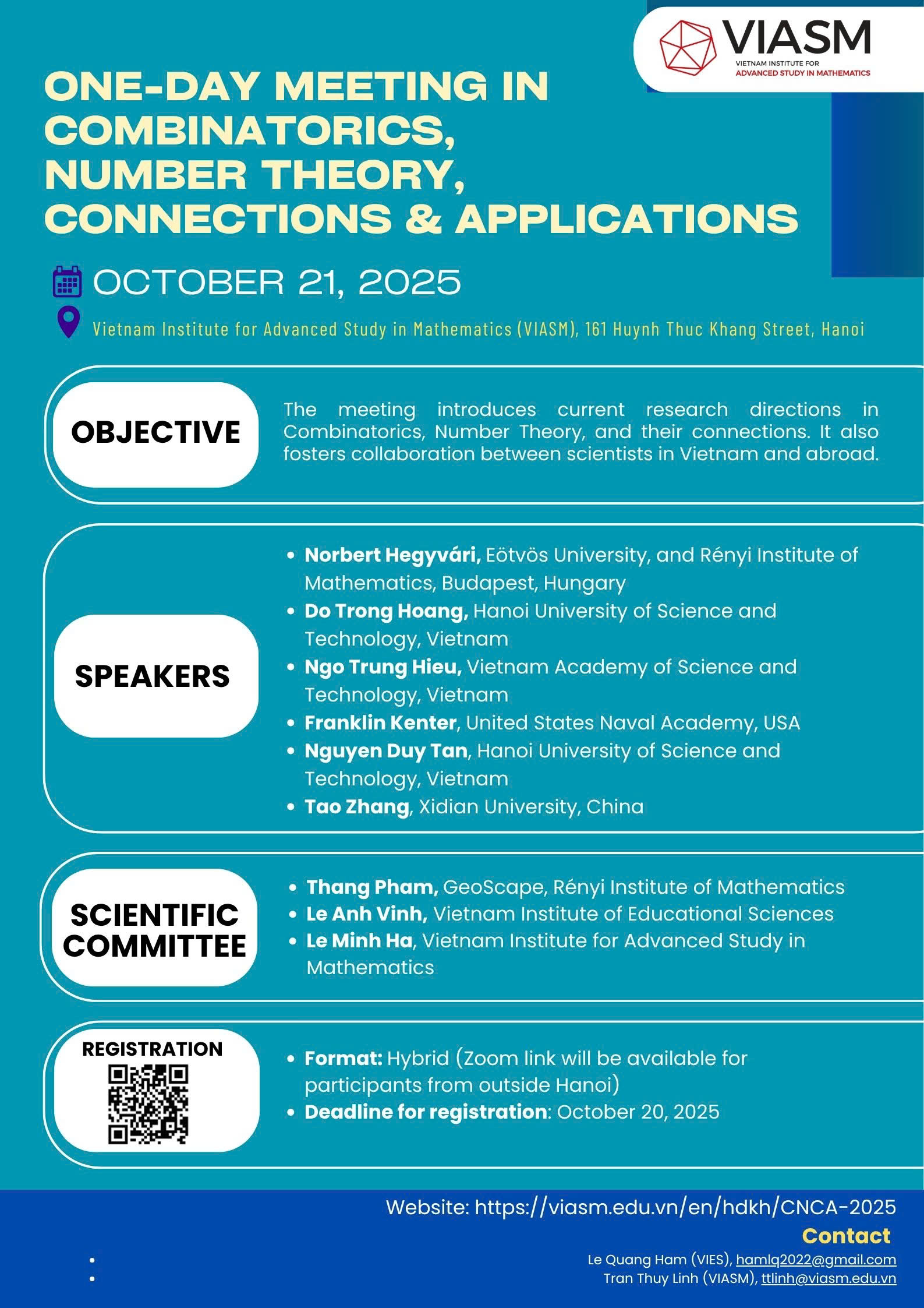 Objective: The meeting aims to introduce current research directions in Combinatorics, Number Theory, and their connections. It also fosters collaboration between Scientists in Vietnam and abroad.