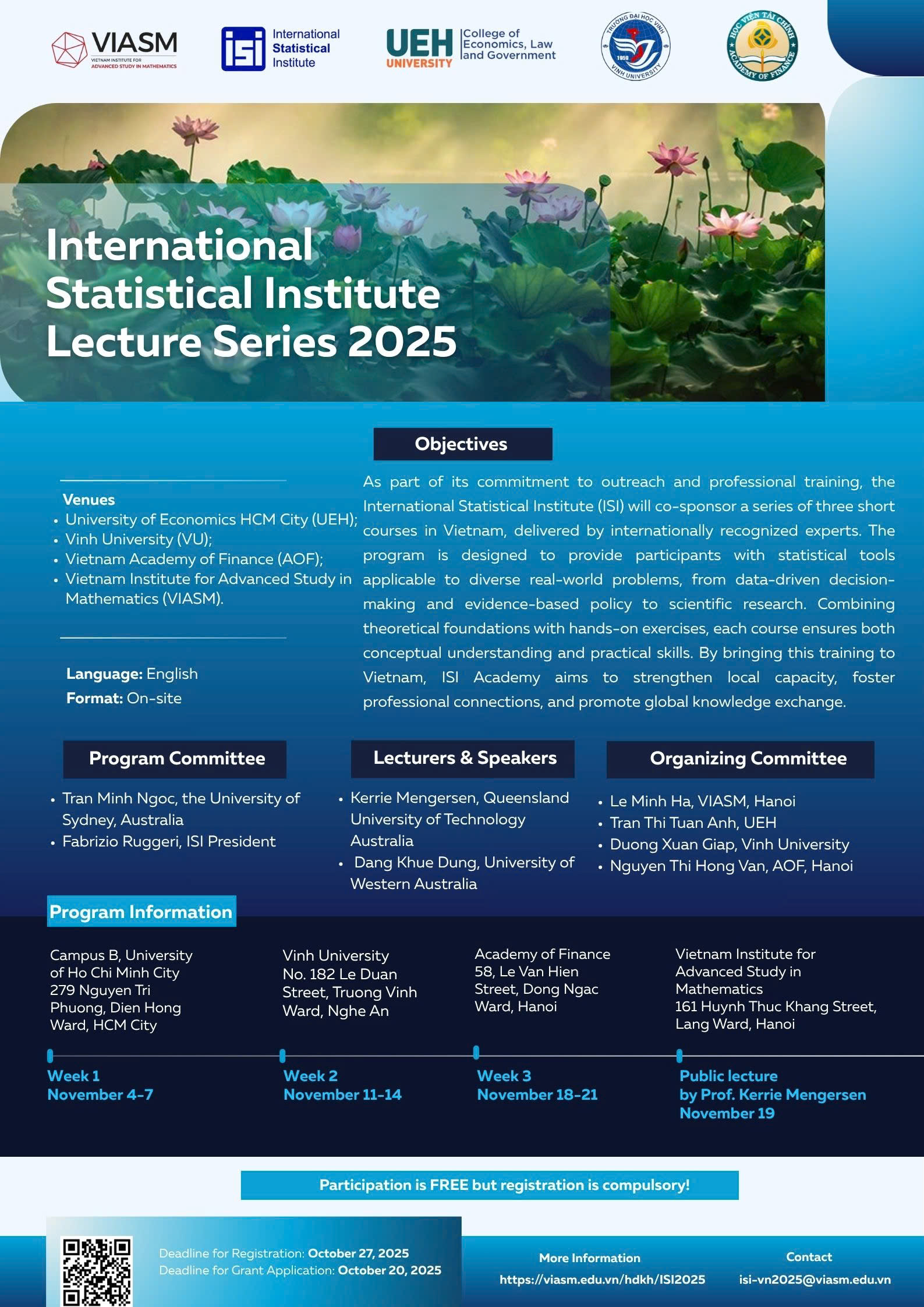 - Public lecture Decoding the SDGs: a Bayesian perspective by Prof. Kerrie Mengersen: 15h00 November 19, 2025 at the Vietnam Institute for Advanced Study in Mathematics, 161 Huynh Thuc Khang Street, Dong Da District, Hanoi.