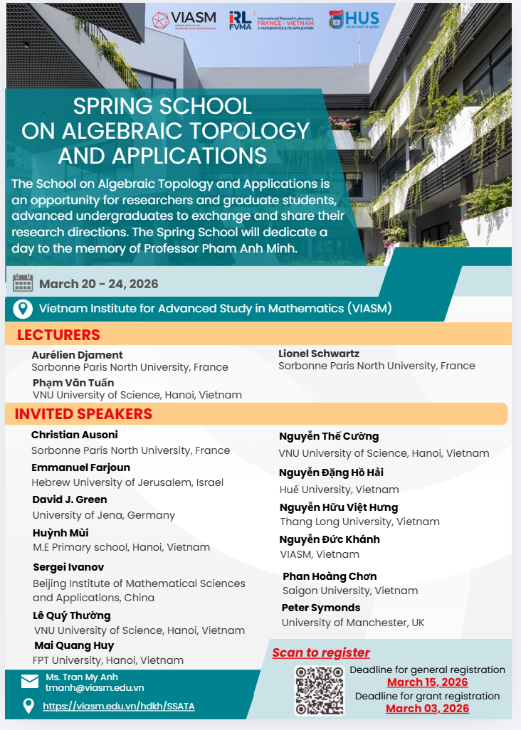 The School on Algebraic Topology and Applications is an opportunity for researchers and graduate students, advanced undergraduates to exchange and share their research directions. The Spring School will dedicate a day to the memory of Professor Pham Anh Minh.