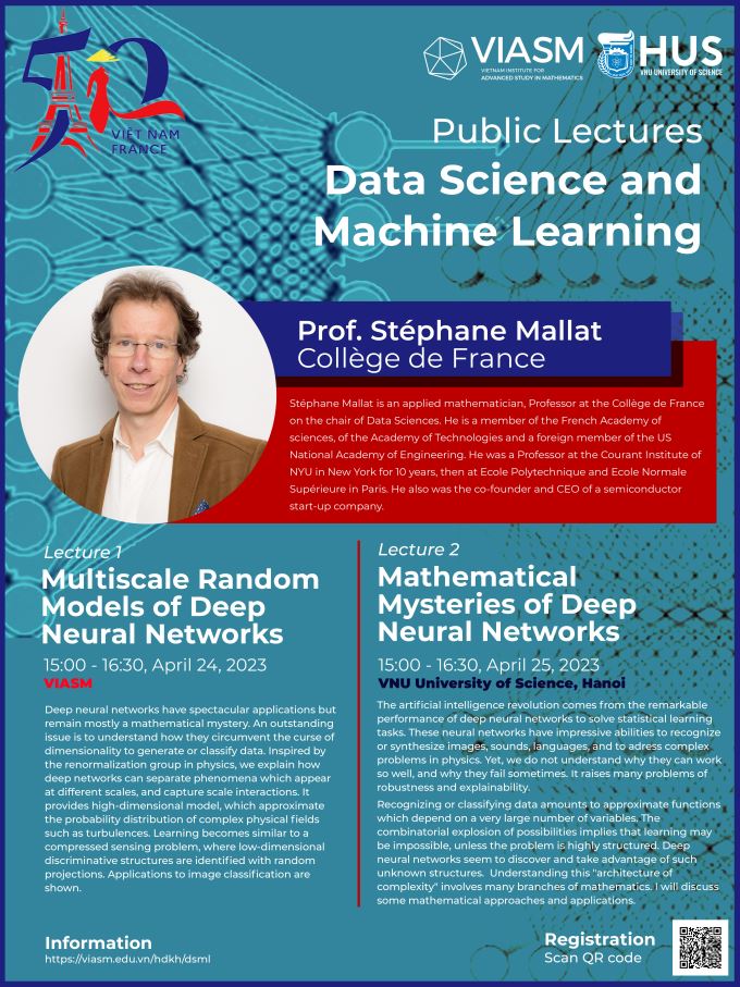 Stéphane Mallat received many prizes for his research in machine learning, signal processing and harmonic analysis. He developed the multiresolution wavelet theory and algorithms at the origin of the compression standard JPEG-2000, and sparse signal representations in dictionaries through matching pursuits. He currently works on mathematical models of deep neural networks, for data analysis and physics.