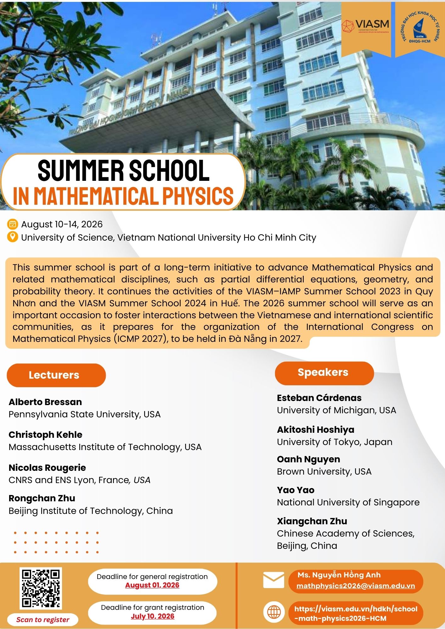 This summer school is part of a long-term initiative to advance Mathematical Physics and related mathematical disciplines, such as partial differential equations, geometry, and probability theory. It continues the activities of the VIASM–IAMP Summer School 2023 in Quy Nhơn and the VIASM Summer School 2024 in Huế. The 2026 summer school will serve as an important occasion to foster interactions between the Vietnamese and international scientific communities, as it prepares for the organization of the International Congress on Mathematical Physics (ICMP 2027), to be held in Đà Nẵng in 2027.