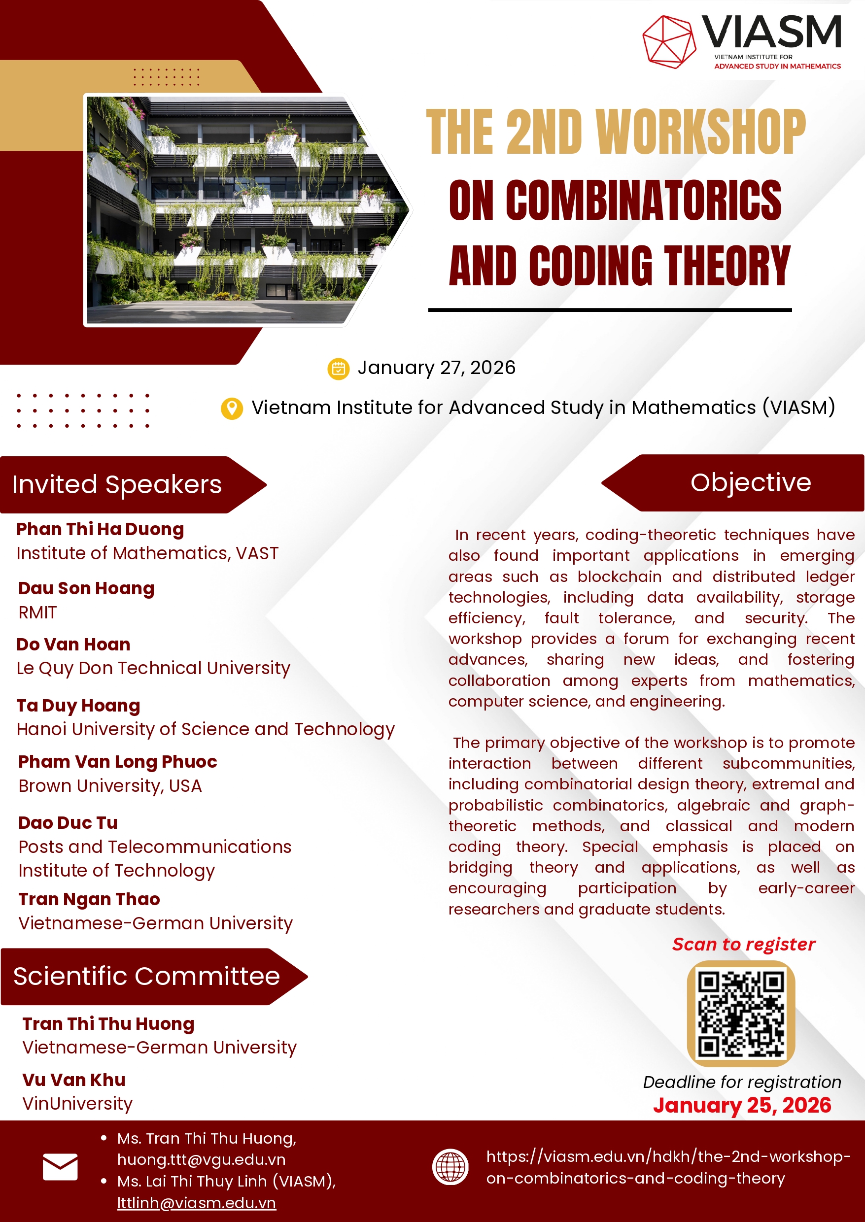 This workshop aims to bring together researchers, practitioners, and students working in the areas of combinatorics and coding theory, two closely related fields with deep theoretical foundations and wide-ranging applications. Combinatorial structures play a central role in the design and analysis of error-correcting codes, while problems arising in coding theory often inspire new directions in combinatorial research. In recent years, coding-theoretic techniques have also found important applications in emerging areas such as blockchain and distributed ledger technologies, including data availability, storage efficiency, fault tolerance, and security. The workshop provides a forum for exchanging recent advances, sharing new ideas, and fostering collaboration among experts from mathematics, computer science, and engineering.