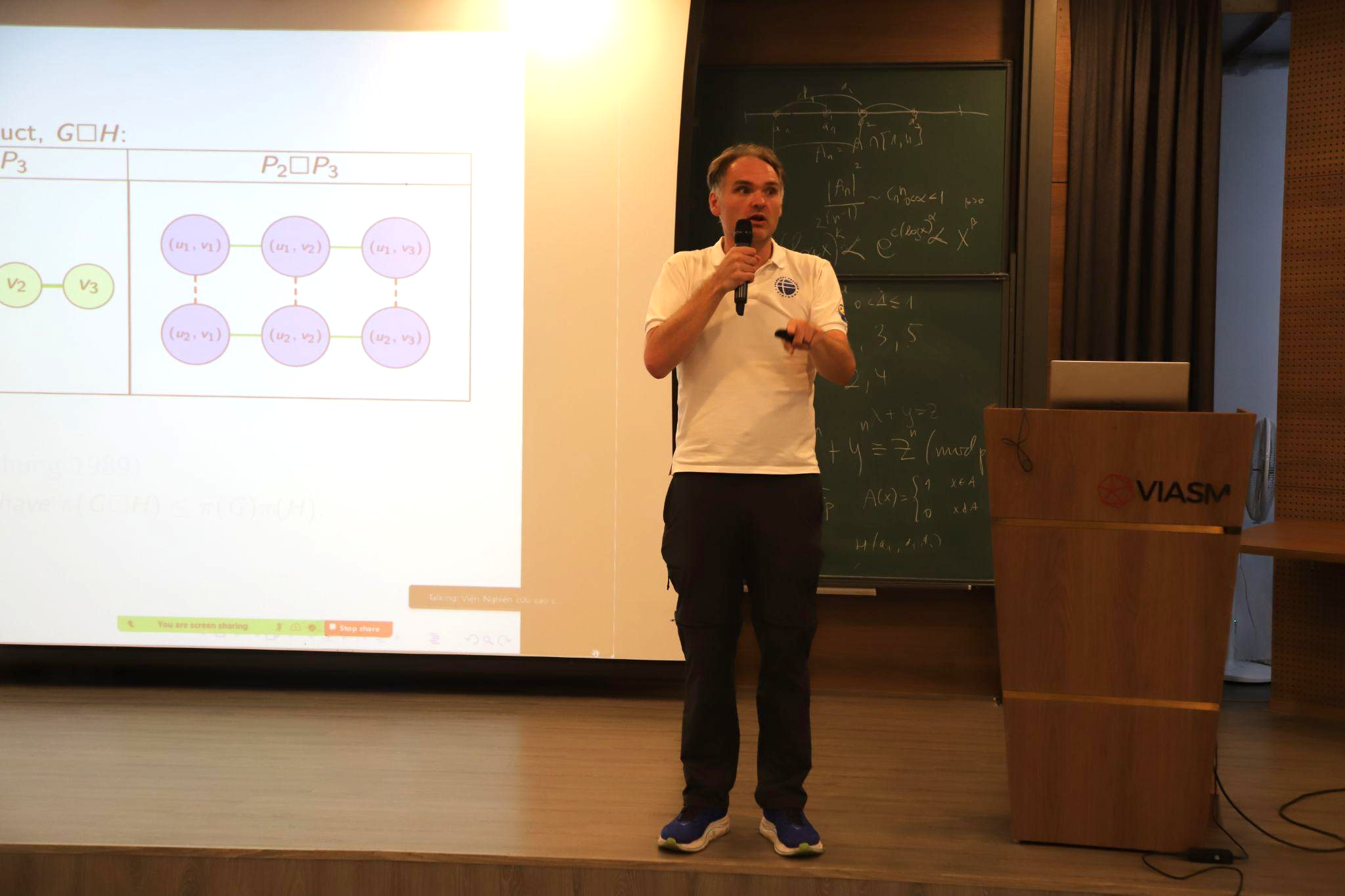 Mở đầu chương trình là Báo cáo mời toàn thể (Colloquium Lecture) của Giáo sư János Pach (Viện Toán học Rényi, Budapest, Hungary) với chủ đề “Chromatic number and graph embeddings”. Là một trong những nhà toán học hàng đầu thế giới trong lĩnh vực Hình học tổ hợp và Lý thuyết đồ thị, Giáo sư đã giới thiệu nhiều kết quả nghiên cứu mới mẻ về sắc số và các bài toán nhúng đồ thị, đồng thời làm rõ những mối liên hệ sâu sắc giữa hình học rời rạc, lý thuyết đồ thị và phân tích tổ hợp hiện đại.